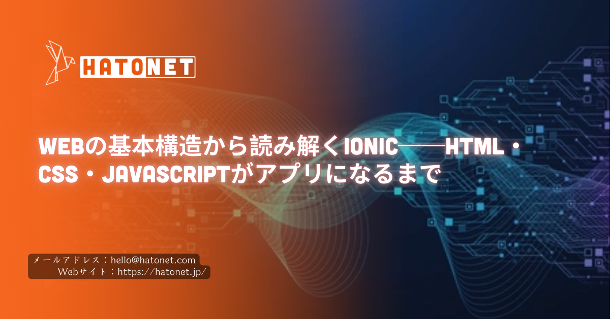 Ionicは「Web技術でモバイルアプリを作れる」という説明で語られることが多い一方で、内部構造を正確に分解して説明される機会は多くありません。特に、HTML・CSS・JavaScriptがそれぞれどのレイヤーで処理され、どこから先はIonicの関与外なのかが曖昧なまま理解されがちです。本記事では、Ionicを構成要素ごとに分解し、処理の流れと責務の境界を明確にします。