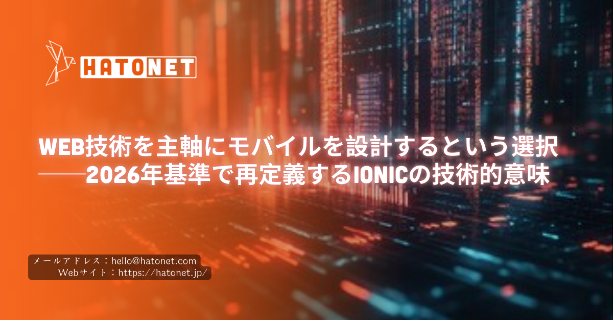 Ionicは決して新しい技術ではありません。それにもかかわらず、2026年を見据えたモバイル開発の現場で、再び選択肢として検討される場面が増えています。その理由は流行でも話題性でもなく、モバイルアプリに求められる役割そのものが変質したからです。本記事ではIonicを便利なツールとしてではなく、Webを中心に据えたモバイル設計思想として捉え、その技術的意味を整理します。